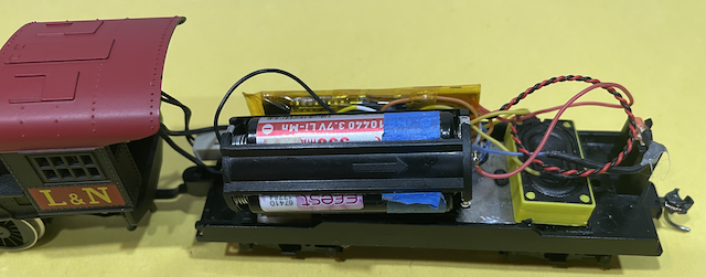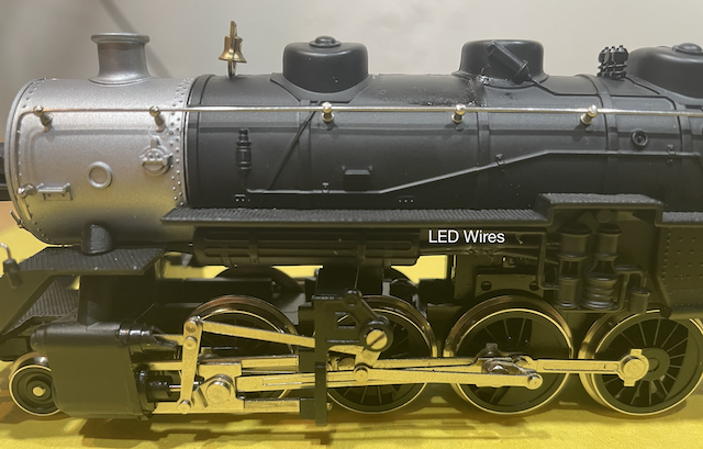The LED was painted. The original light hole, in the front of the loco, was drilled out to the next size. The black wires were solded to the LED with a piece of tape on the positive black wire to identify it. The LED leads were shortened before the wires were attached. The shortened LED leads, with the wires attached, were bent down and exit a hole/slot new the front and run under the boiler. The boiler is completely filled with a cylindrical weight. I did try to feed the wires through the boiler, but the weight wouldn’t allow for that. The weight is quite massive! I did have to remove the shell to access the wires, lubricate the motor and run the wires through the cab.