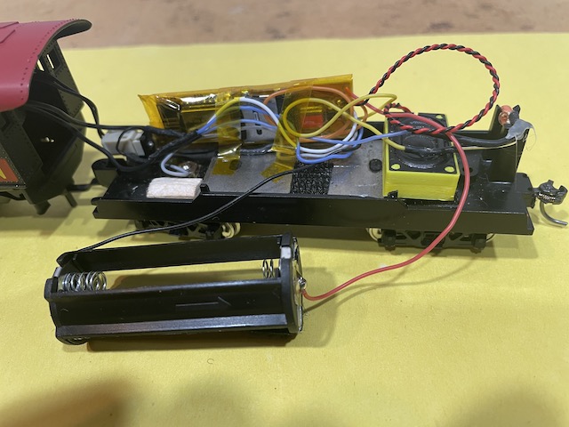 The white and blue LED wires come from the front of the loco, under the boiler and exit through the cab to the tender.
