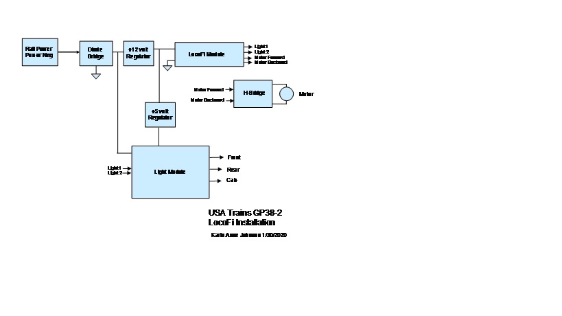 It was desired to use a LocoFi module to control the power applied to the two motors in a USA Trains model GP38-2 locomotive. In addition control of the lights used in this locomotive was also desired. With regard to the lights, the LocoFi module only provides for two light control outputs. The GP38-2 locomotive has front, rear and cab lighting. A method would have to be determined to control more than two lighting features.