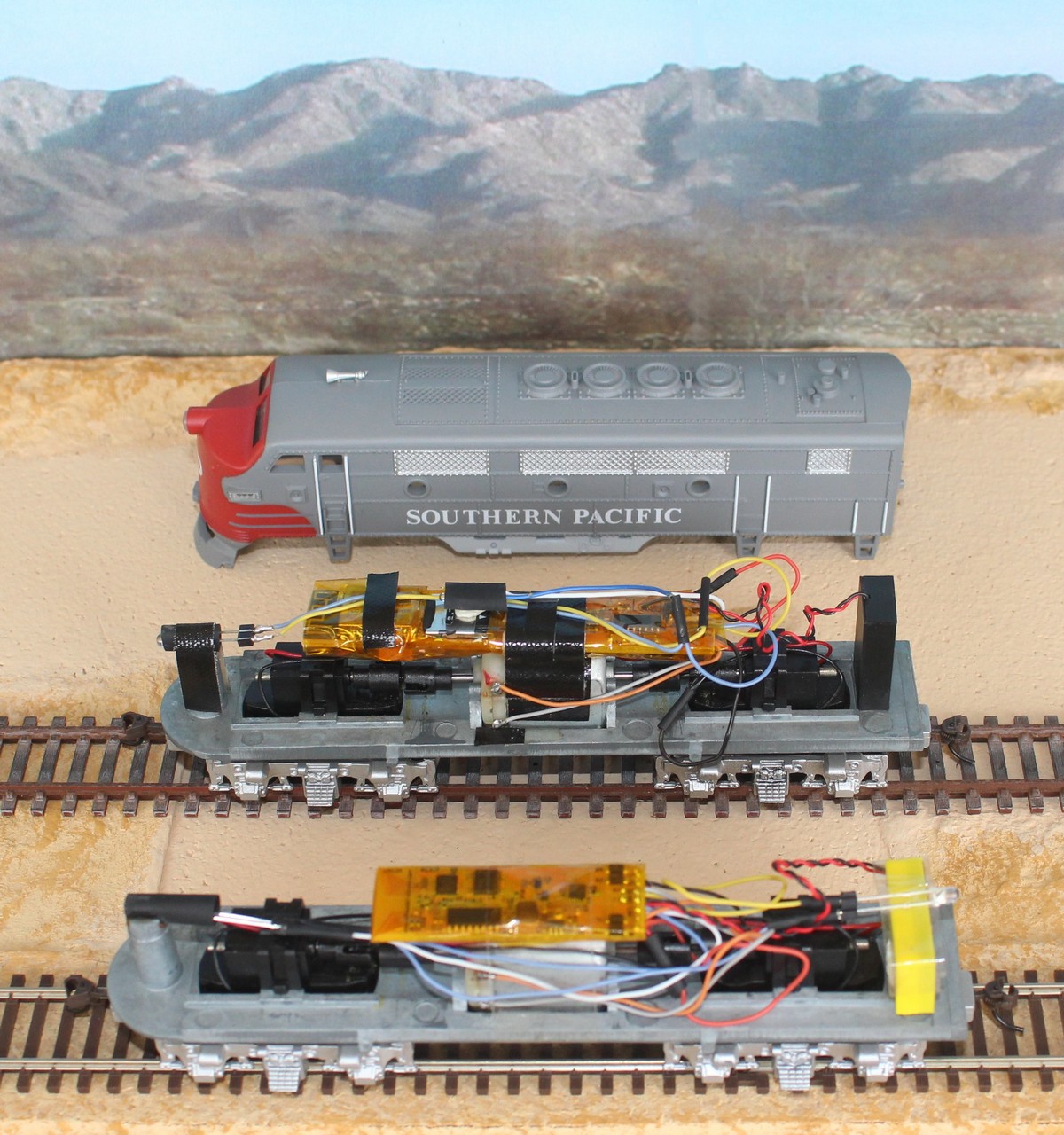 Interested in the wireless control of model trains, I have acquired over time two Locofi modules, type DDLLHA and DDLLHB. These modules were fitted to two Model Power EMD F2-A locomotives, as you can see in this photo.