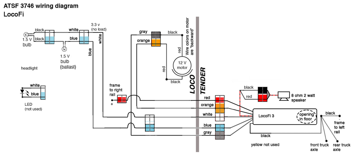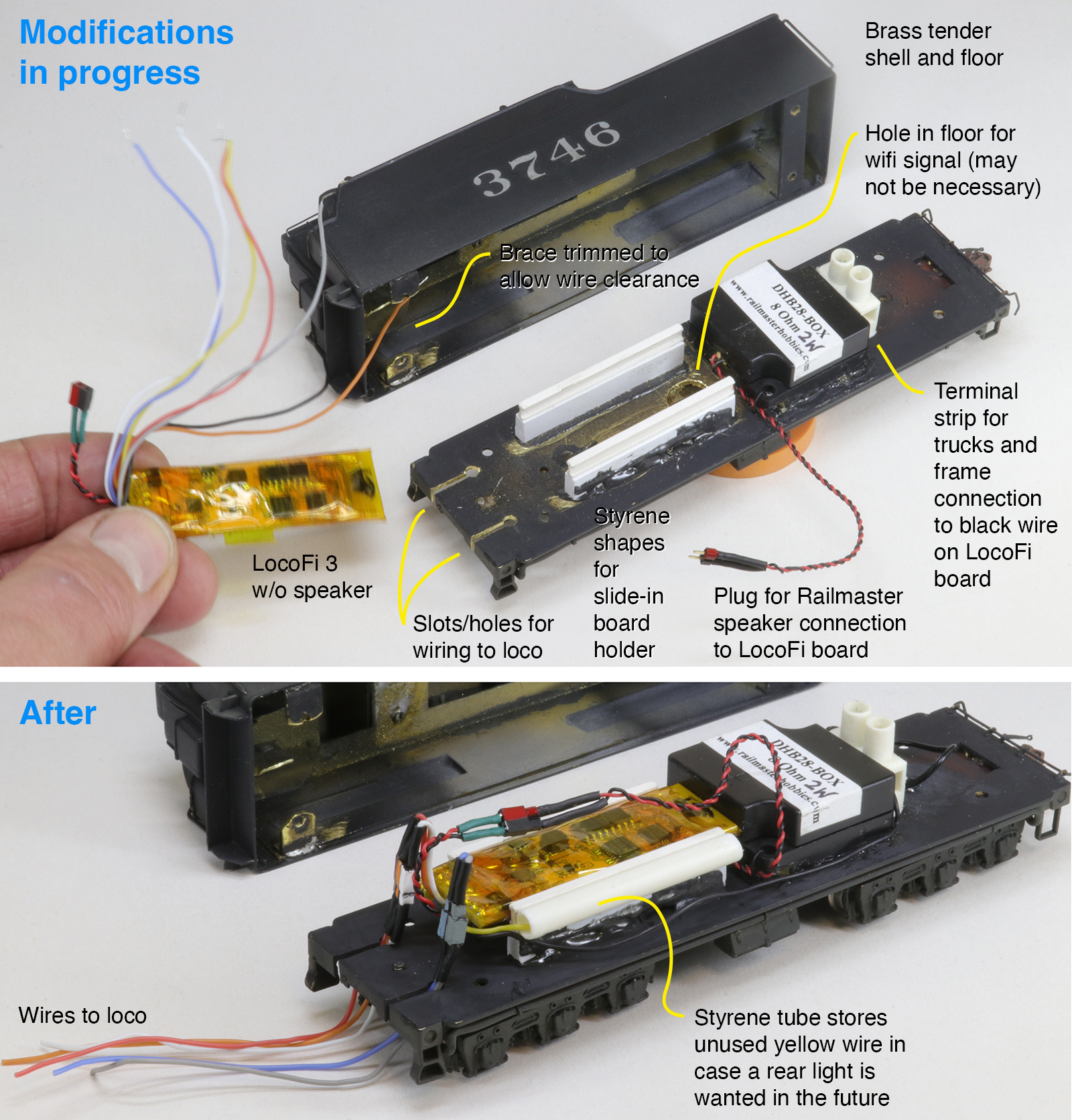 I set up and painted this loco years ago for DC-only operation but included connectors and a speaker in the tender to make it easy to convert to a DCC board in the boiler later. Recently I revised it to install the LocoFi 3 board in the tender just in case it needed a hole to receive a wifi signal. I had already epoxy glued a speaker in place so I used it instead of the LocoFi speaker. I try to make components removable so I drilled holes and cut slots in the tender floor for the wiring so I wouldn’t have connectors visible between the loco and tender. Later, the visible wires were painted with Tamiya acrylic Rubber Black.