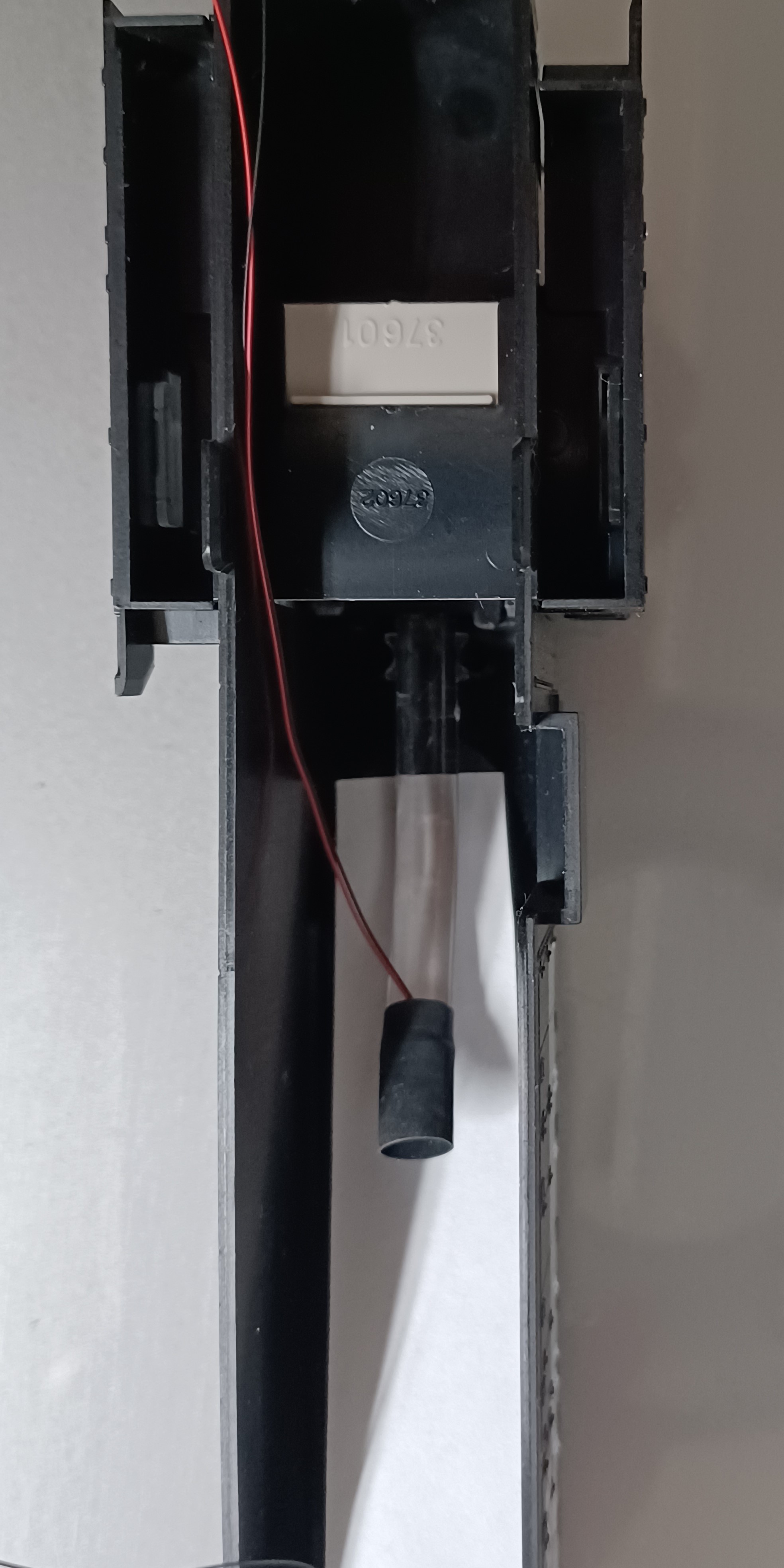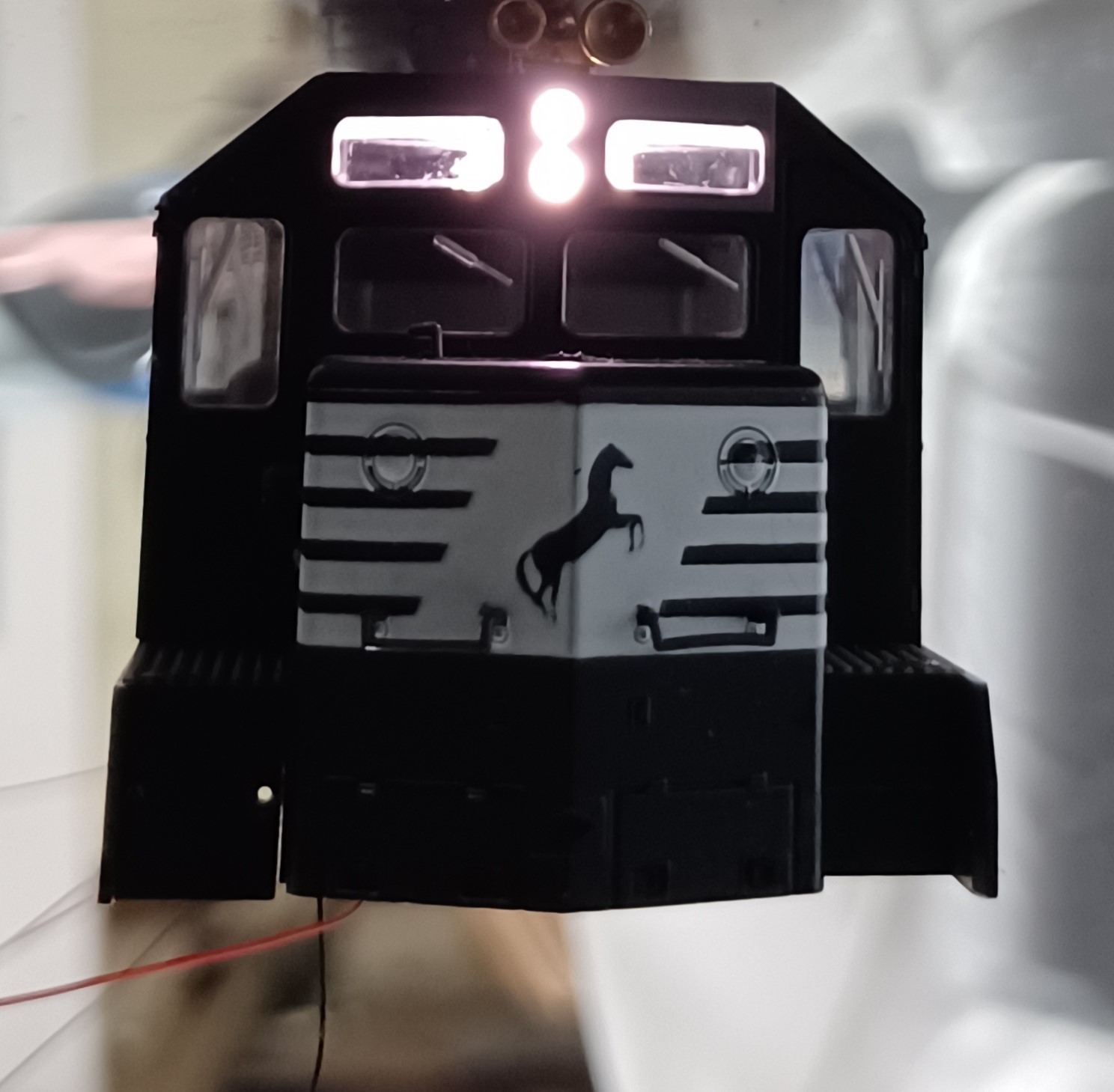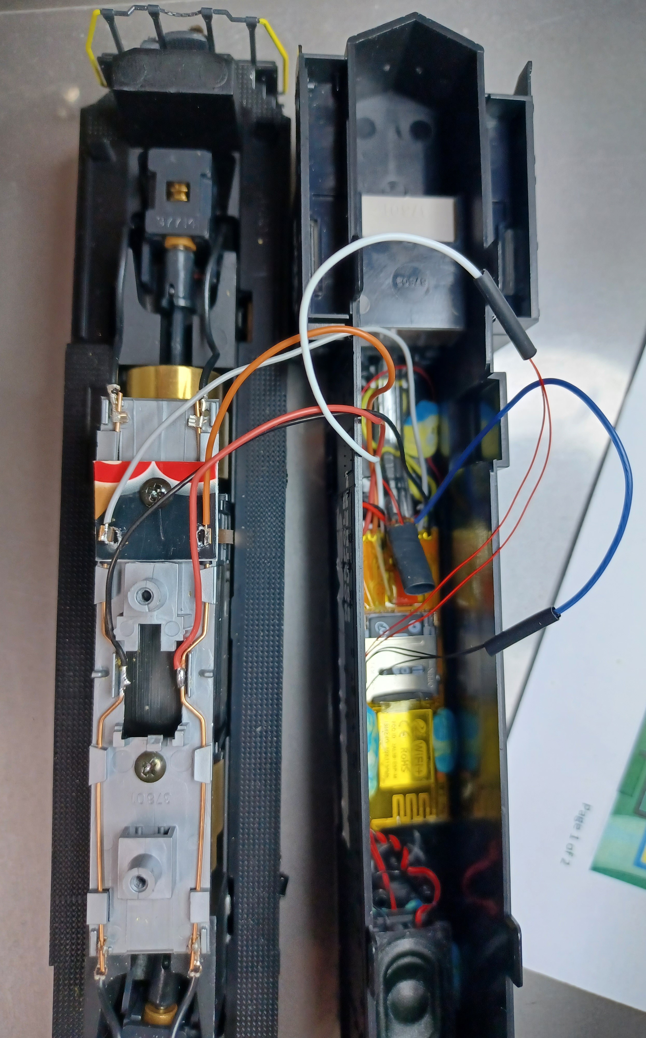 As in my earlier write up on RS2, I use the same material and remove some parts to make room for the LocoFi board (LF). In this case, I had to remove the weight, the rear light pipe and the light board. They go in the box for future-if it becomes necessary. I use the same type of 2xSMD LEDs for the back and just 1 for the front. The rear LEDs are sitting in the 2 holes that had the light pipe protrusions. The front LED is secured to the original light pipe with a piece of heat shrink tubing.