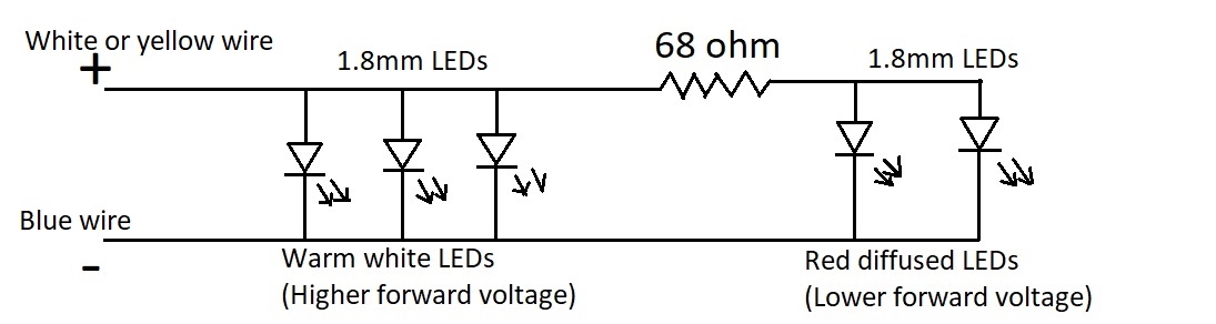 A small note about LEDs (because you mentioned “too cool”). The onboard resistors are appropriate for warm white, blue or white LEDs only whose voltage drop is between the range of 2.7V – 3.3V. The light outputs support a max source current of about 12mA. As such, if someone plans to use red or green LEDs that have a lower voltage drop, the onboard resistors may not be enough and risk overloading the light outputs. In case of those LEDs (e.g. some locos use red LEDs on the rear that are automatically lit when front warm white lights are lit and vice versa), adding an additional 68ohm or so external resistor is recommended in series only for the current path going to them. See example schematic below: