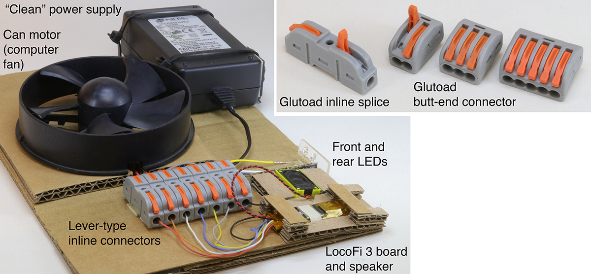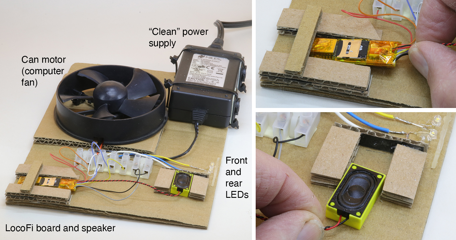 Here’s a way to test your control unit before installation. The base is double-thick corrugated cardboard sized to fit the components. Any old can motor will do to take the place of a loco motor. This one was a computer fan. It was easier to just mount the whole fan instead of taking the motor out and then making something to hold it. The power supply is a leftover from some forgotten piece of computer gear. For electronic control of locos the power supply must be “clean” — don’t try to cheap out by using a regular DC train power pack.