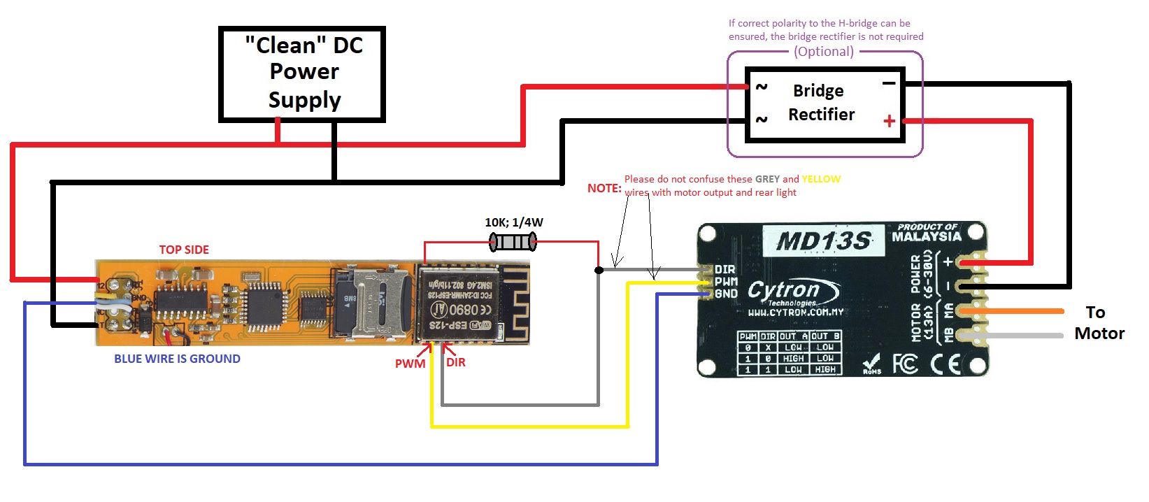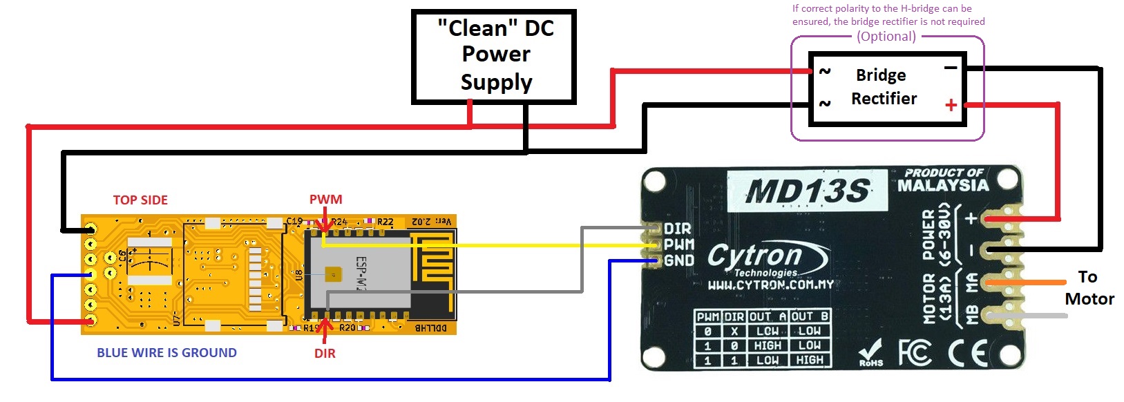 The “clean” DC power can be battery or even AC that had been rectified and filtered. Please note that MD13S is only an example. Any H-bridge that accepts DIR and PWM as inputs can be used instead.