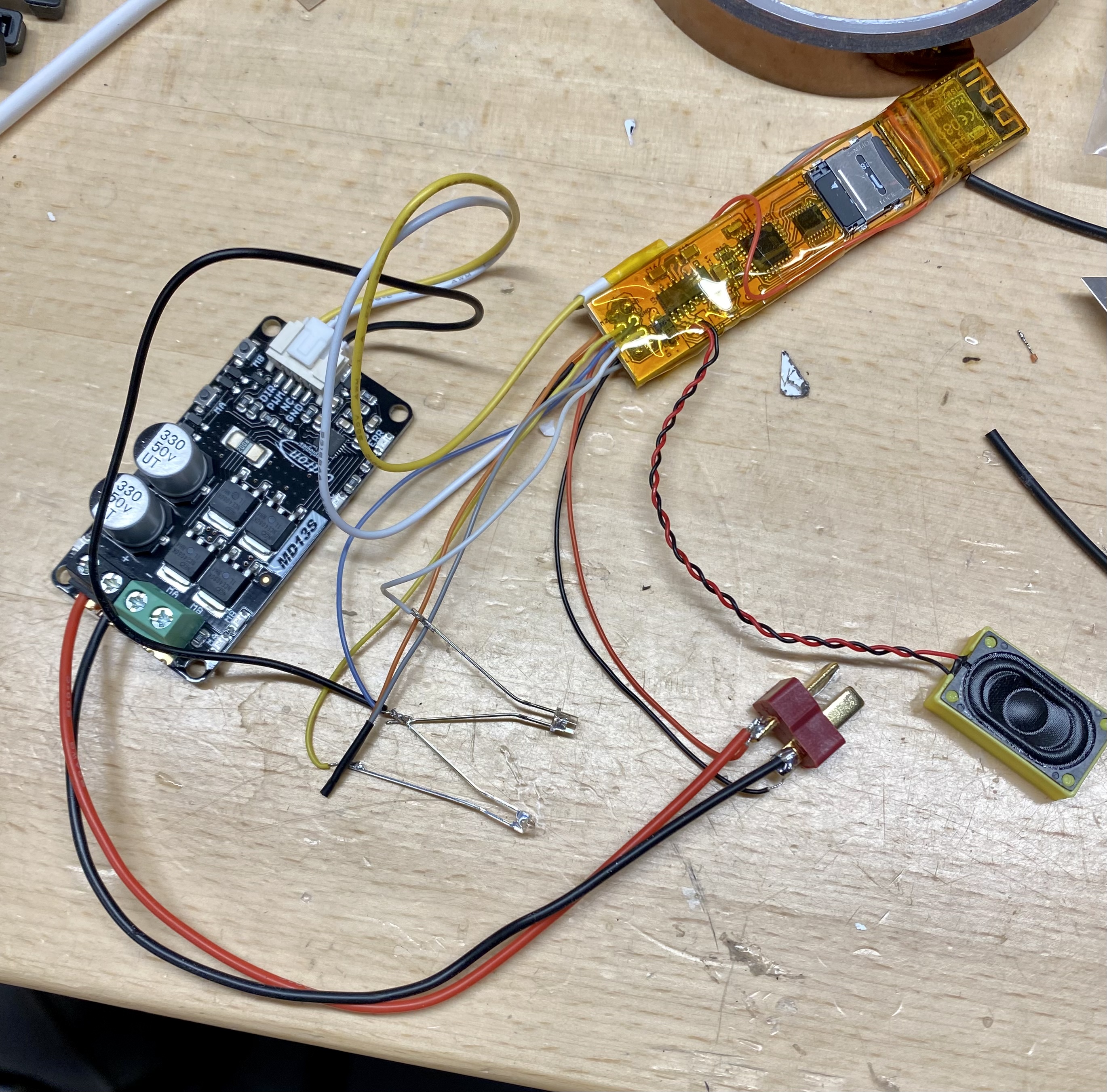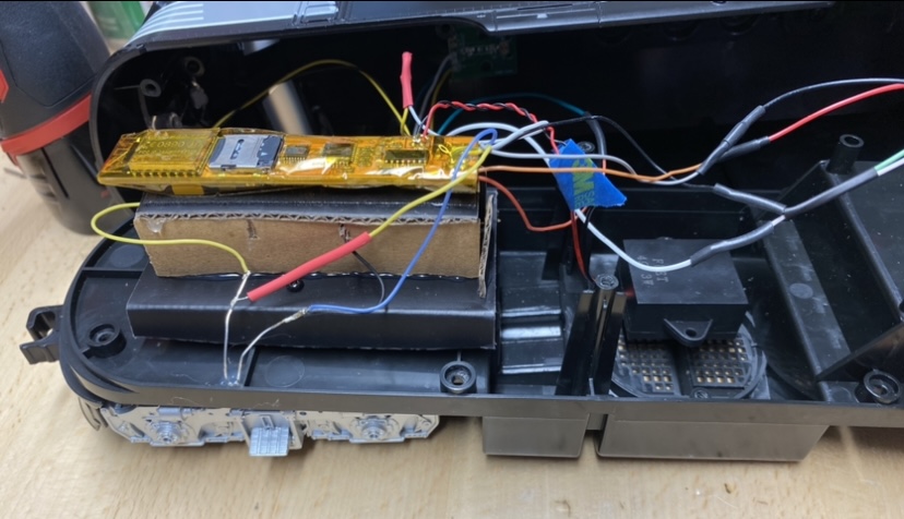 I needed a way to mount the LocoFi DDLLHA unit in the front of the Loco so that wiring it was simple, the SD card was easily accessible and in a way that allowed the front trucks to pivot freely. So a doghouse/stand was created. The LocoFi module is simply attached with double sided “servo” tape. This is kind of a working mock-up approach to test as I go..hence the blue tape isolating some conductors..